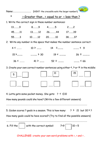 Greater Than / Less Than Worksheets - Super Teacher Worksheets Worksheets for comparing numbers using greater than, less than and equal to symbols. Difficulty levels vary from two-digit numbers up to six-digit numbers. Worksheets include 'Greater Than Alligator' and 'Less Than Alligator' activities, as well as practice using the symbols <, >, and =. Comparing and Ordering Numbers 1-Digit Numbers: Comparing